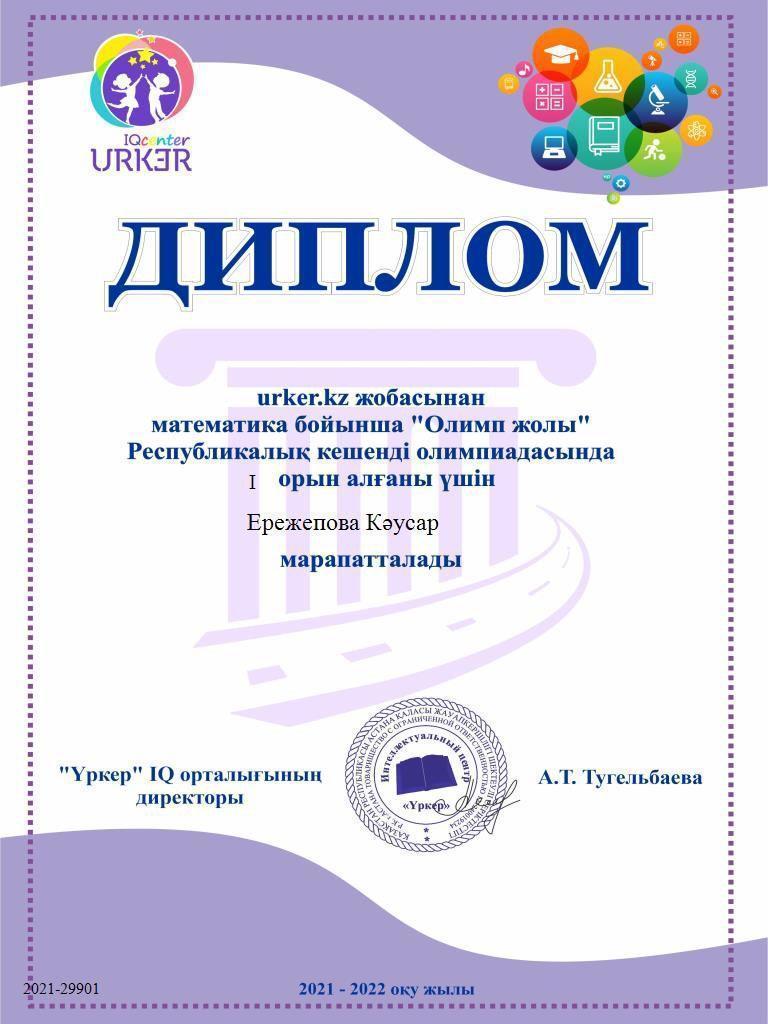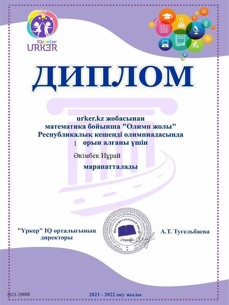 Республикалық олимпиада І орын алғаны үшін 8 сынып оқушысы Мырзағалиева Аяулым марапатталды