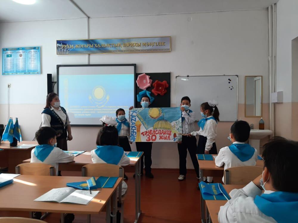 «Қазақстан» егеменді ел болып, дүниежүзіне танылды. 120-дан аса ұлт өкілдері тұратын осынау қасиетті мекенде, асқақтаған өлкеде, кеңшілігі керемет дархан дастархандай далада, егіні теңіздей толқыған, төрт түлігі өрбіген, өндірісі өркендеген мекенде өмір сүруші әрбір адам өз Отанын жанындай сүйіп, оның көк байрағын көкке көтеруді мақтаныш тұтады. Осы айтулы мерекеге орай мектеп-интернатымызда "Тәуелсіздікке 30 игі іс" атты тәрбие сағаттары өтуде. Тәрбие сағатының басты мақсаты: Оқушыларға еліміздің тәуелсіздік алғалы жеткен жетістіктерімізбен таныстыру, білімдерін кеңейту; Отанды сүюге, ел байлығын қорғауға, болашақ Отанымыз Қазақстанды өркендетуге білімді адамдар керек екенін ұғындыру; бүгінгі тәуелсіздікке қалай қол жеткенін зерделеу, оларды Отаны үшін отқа түсетін ел жанды, ел азаматы етіп тәрбиелеу. Жауапты мұғалімдер: 5- сынып тәрбиешілері Магперова Н, Қайратов М. Независимость-наша главная ценность. Только после бескровного, мирного достижения независимости мы смогли вывести нашу страну в число цивилизованных государств мира. За 30 лет мы пережили непростые рыночные переходы, сформировав независимую Казахстанскую страну. Именно сегодня и всегда рассказываем о заслугах дальновидного политика первого Нурсултана Назарбаева, который в этот период привел Казахстан к тому, что его признают и уважают самые сильные государства во всем мире. » Казахстан " стал суверенной страной и признан во всем мире. Каждый человек, живущий в этом священном месте, в котором проживают представители более 120 национальностей, в возвышенном крае, в степи с великолепным пространством, в волнении моря, в процветающей стране, где процветает производство, гордится своей Родиной, ее голубым флагом. В честь этого знаменательного праздника в нашей школе-интернате проходят воспитательные часы "Тәуелсіздікке 30 игі іс". Главная цель воспитательного часа: познакомить учащихся с достижениями нашей страны за независимость, расширить знания; Осознание того, что нам нужны знающие люди, чтобы любить Родину, беречь богатство страны, чтобы наша будущая родина процветала в Казахстане; изучение того, как мы достигли независимости сегодня, воспитание их как людей, которые горят огнем за Родину, как граждан страны. Ответственные учителя: воспитатели 5- класса Магперова Н., Кайратов М.