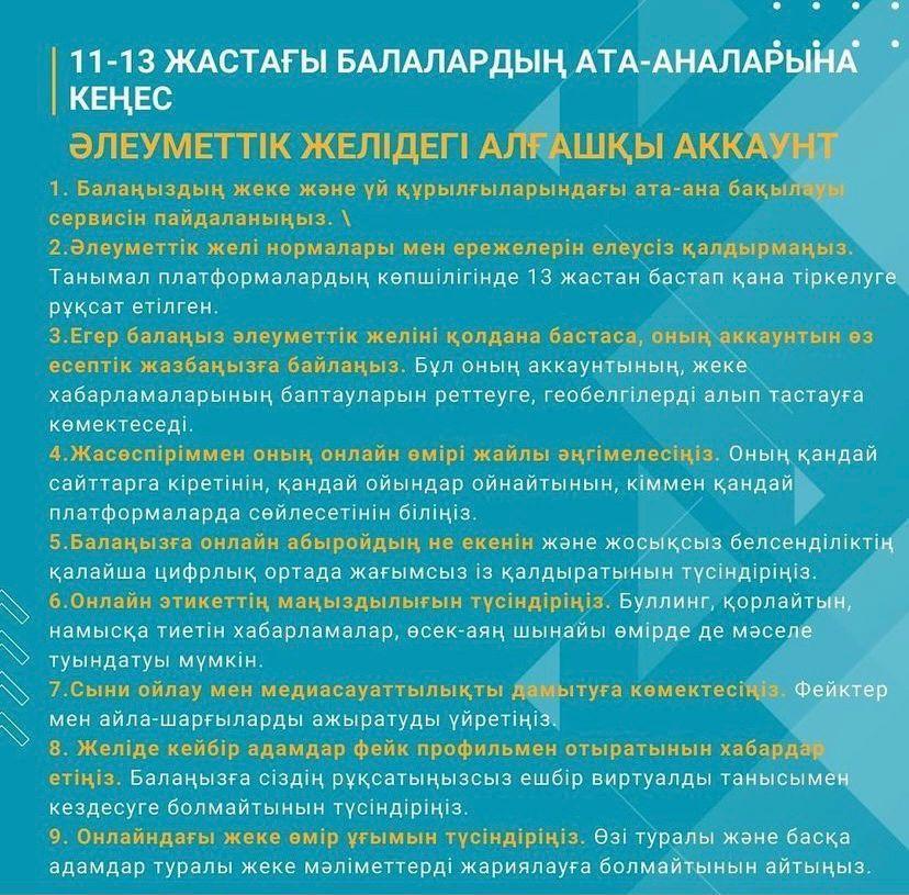 29 сәуір 2024 0 1 2 3 4 5 Баланы өмірінің түрлі кезеңдерінде онлайн кеңістікте қорғау бойынша ата-аналарға арналған ұсынымдар.