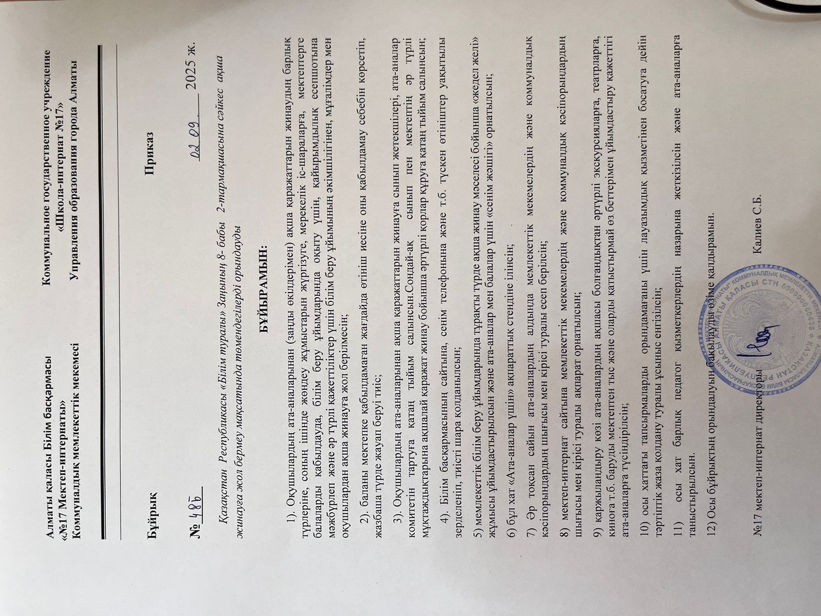 02 қыркүйек 2025 0 1 2 3 4 5 Бұйрық: ҚР-ның "Білім туралы" Заңының 8-бабы 2-тармақшасына сәйкес ақша жинауға жол бермеу