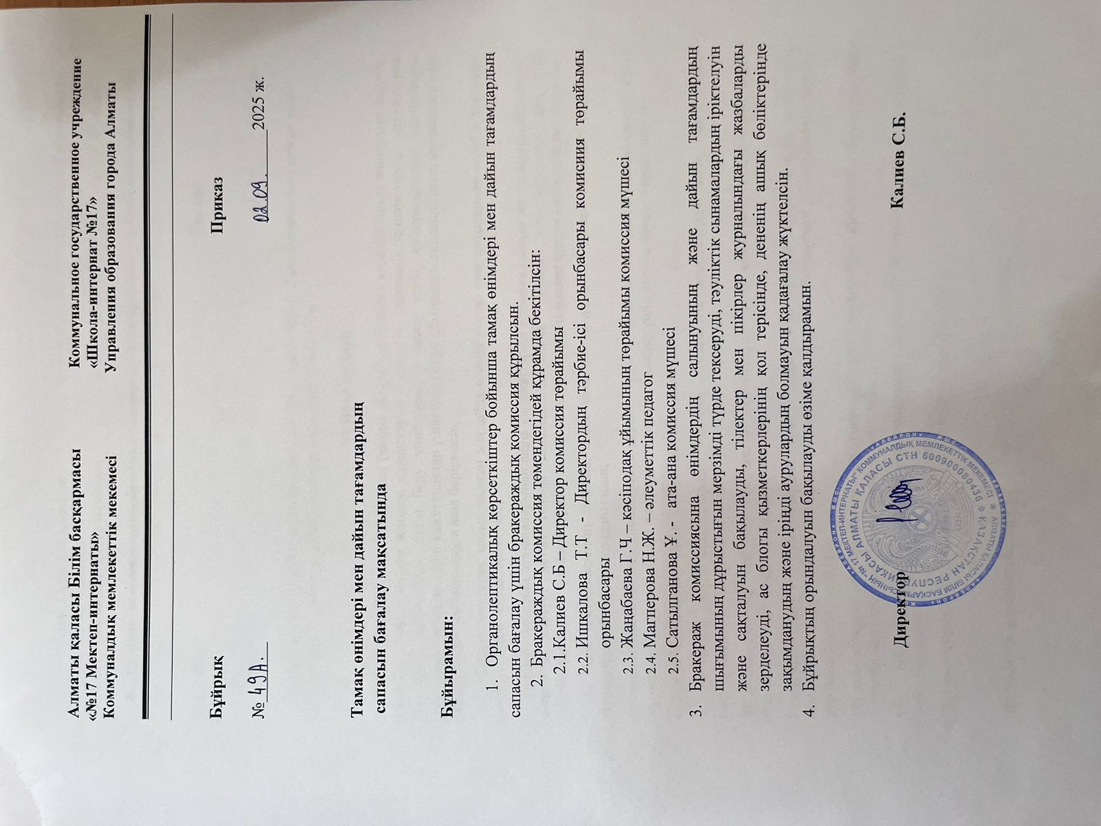 » Бұйрық: "Тамақ өнімдері мен дайын тағамдардың сапасын бағалау"