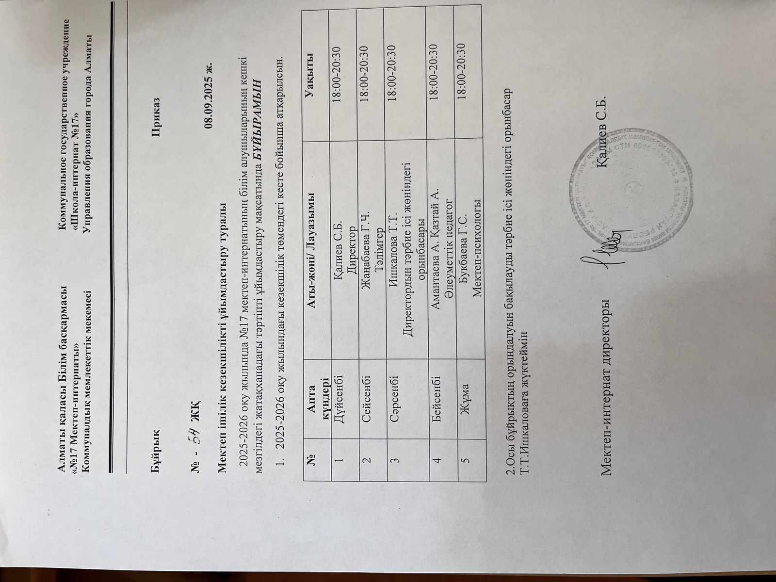 Бұйрық: "Мектеп ішілік кезекшілік"